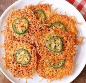 2. Spoon about a tablespoon of Parmesan into a small mound on the parchment paper. Top with about half tablespoon of cheddar.
