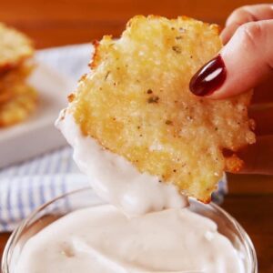 Preheat oven to 450 degrees. Add all ingredients to a bowl. Line a baking sheet with parchment paper. Place about 1 TBSP of mixture on prepared baking sheets, about 1 inch apart. Bake at 450 for 5-7 minutes. Remove and turn cauliflower chips over. Bake for another 5-7 minutes.