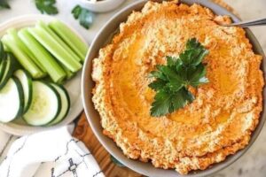 3. To serve, place the hummus in a bowl and serve with celery sticks, raw radish chips, or other vegges to dip with.
