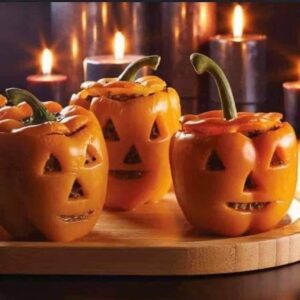Preheat oven to 400 degrees. Cut bell peppers in half lengthwise, trim off stems, and remove seeds. OR – carve into adorable pumpkins with your children 🎃 and win mother of the year award. 🏆 Place peppers face down on a baking sheet and lightly rub tops of peppers with olive oil and sprinkle with salt. Bake for 12 minutes or until peppers are soft and getting browned.