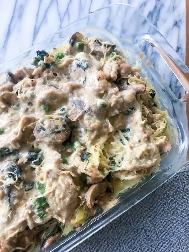 When the squash is done baking, use an oven mitt to hold each half and scrape out the “spaghetti” into a large mixing bowl with a fork. Add the cooked turkey and creamy vegetable mixture. Toss to combine and transfer everything to a baking dish.