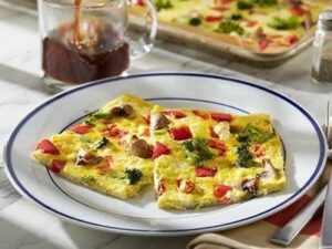 4. Sprinkle red bell pepper, broccoli florets, mushrooms, and feta evenly over beaten eggs.