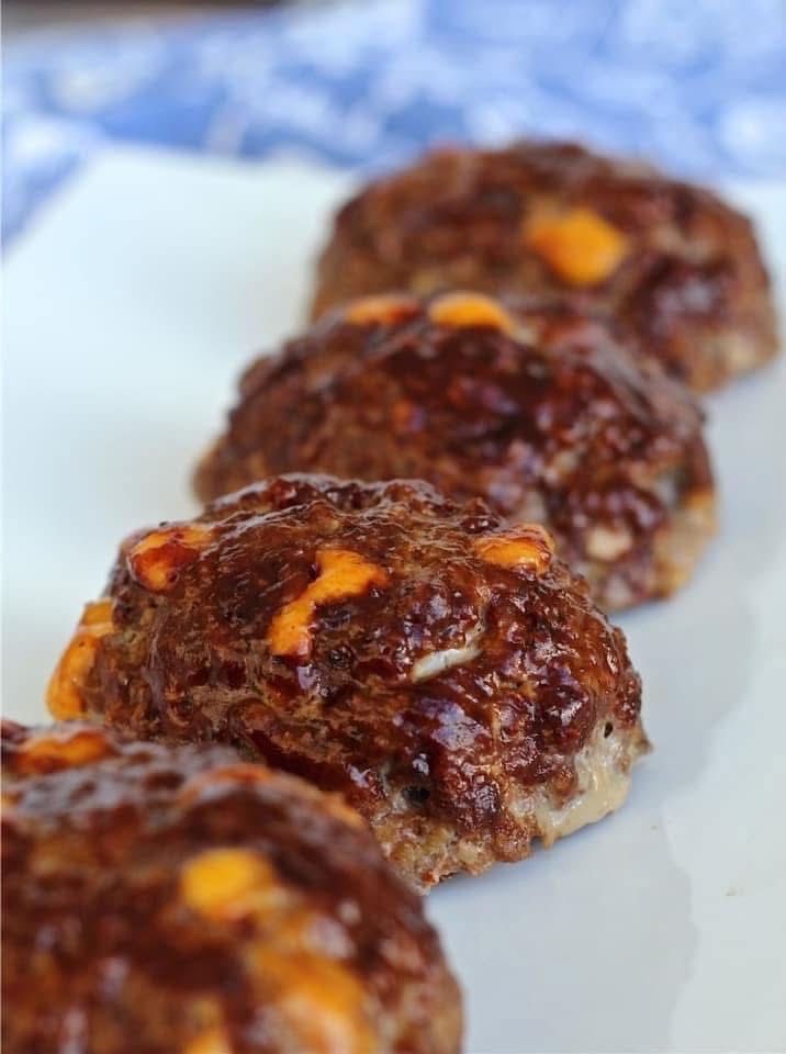 In a large bowl combine the ground beef, egg, 4 tablespoons BBQ sauce, cheese cubes, caramelized onions, and a dash of salt and pepper. Mix together just until combined.