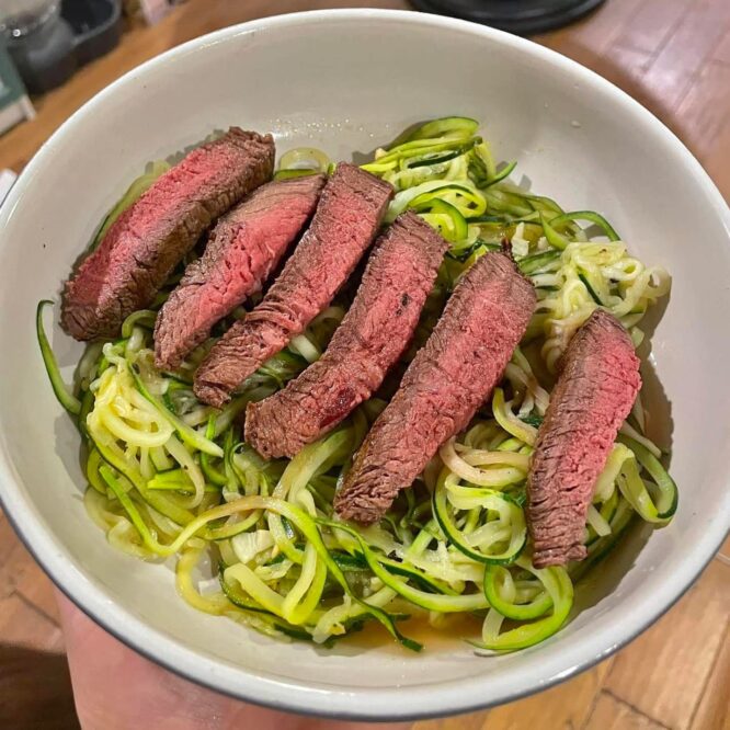 Lemon Garlic Steak w/ Zoodles Ingredients: 1 ½ pounds flank steak (raw weight) 4 ½ cups zucchini 2 garlic cloves