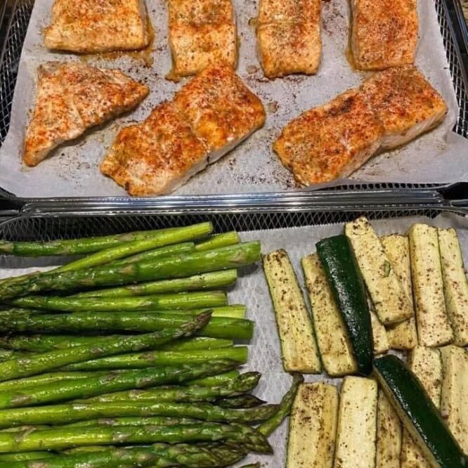 Baked Salmon w/ Asparagus & Zucchini Makes 1 serving 1 leanest 3 greens 3 condiments Ingredients: 7 oz raw salmon