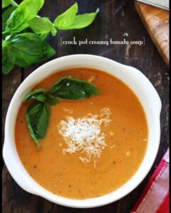 Remove bay leaves then puree mixture well with a blender. If your crockpot doesn’t keep all the moister in well while cooking, you may need to add in ½ cup water or so at this point. This helps make sure the soup isn’t too thick. Reduce heat to warm, stir in heavy cream. Serve topped with parmesan cheese and fresh basil.